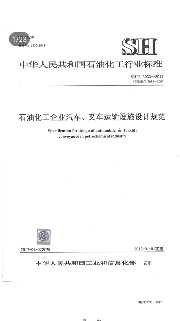 由中華人民共和國工業和信息化部發布的《中華人民共和國石油化工行業標準》中的《石油化工企業汽車、叉車運輸設施設計規范》(以下簡稱:規范)于2018101日正式實施。