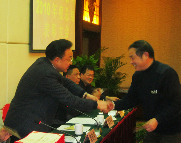集團財務總監賴建武宣讀2010年集團表彰通報。陳勇等29名技術骨干獲得專利、技術創新獎;41名員工獲得突出貢獻獎,并頒發獎金獎狀。
