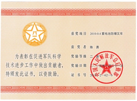 近日,浙江佳力科技股份有限公司與總后勤部建筑工程研究所共同開發研制的 “2010-0.4蓄電池防爆叉車”項目,榮獲軍隊科技進步獎二等獎。我公司總工程師陳勇以項目負責人之一的身份,加入該項目研制的項目組,成為重要的項目完成者之一,榮獲軍隊科學技術進步獎二等獎。