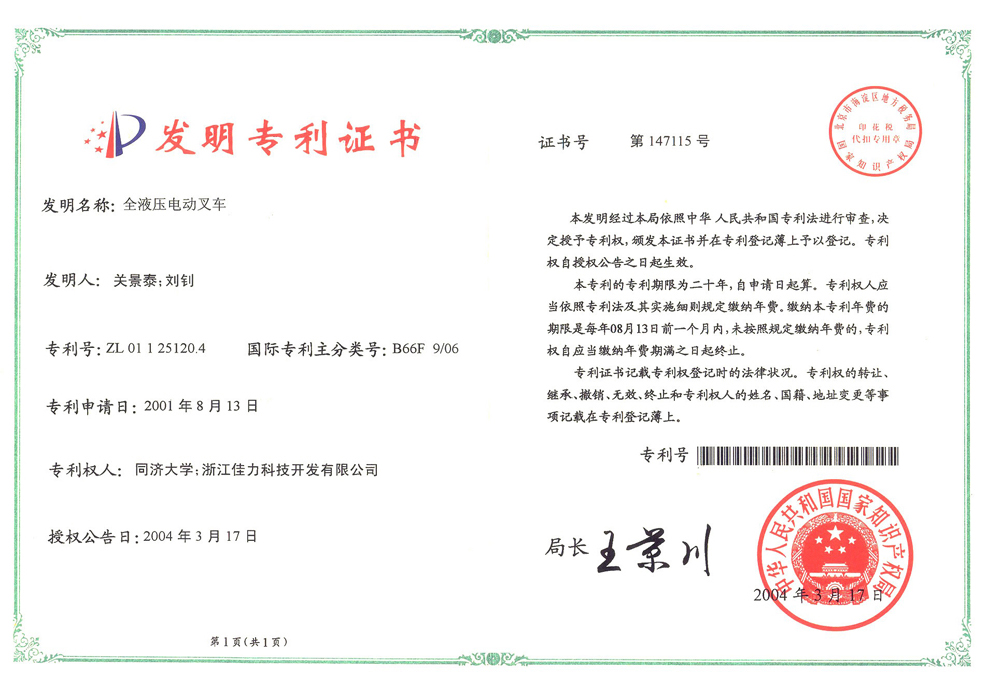 發明專利(全液壓電動叉車)