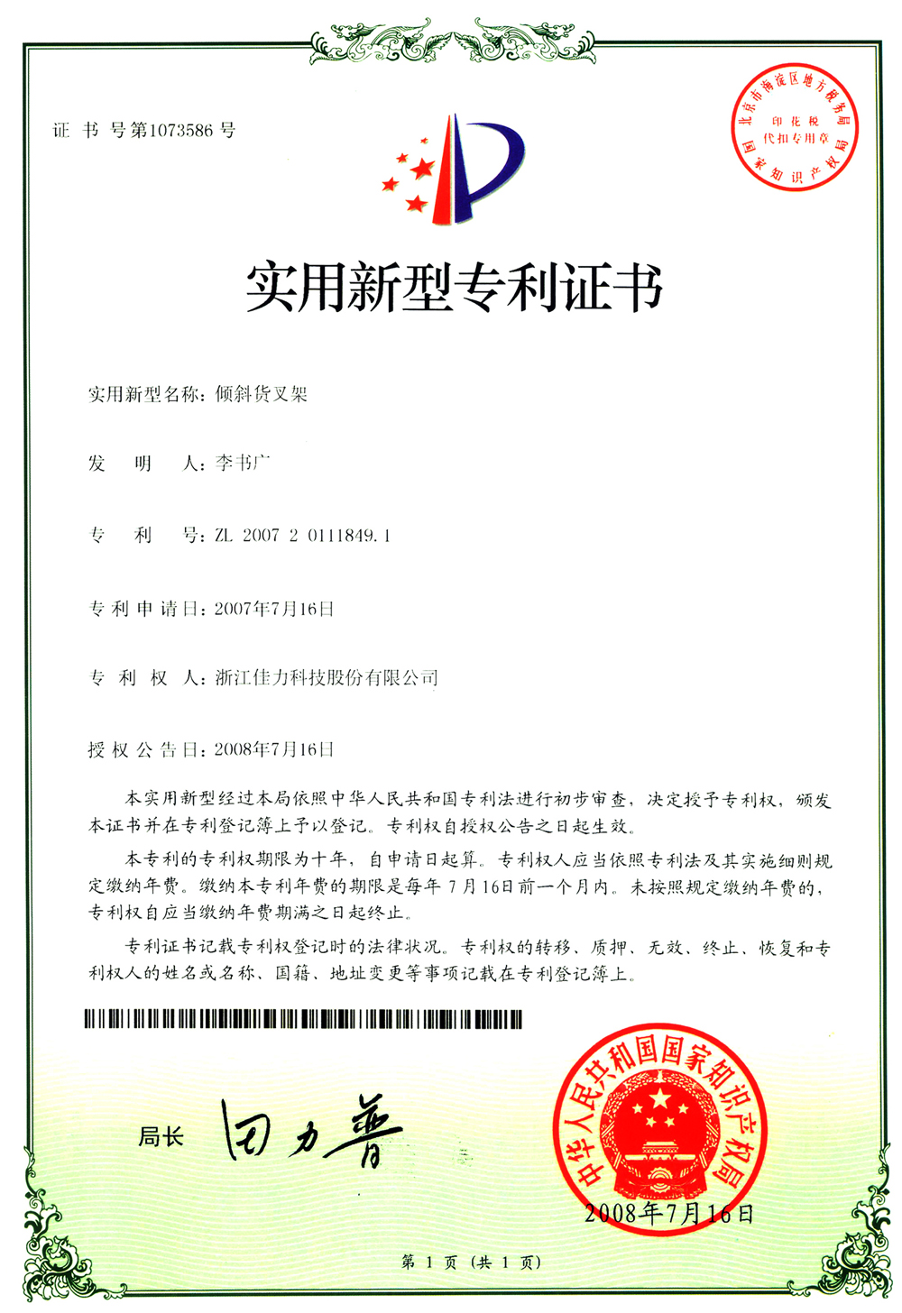 實用新型專利證書